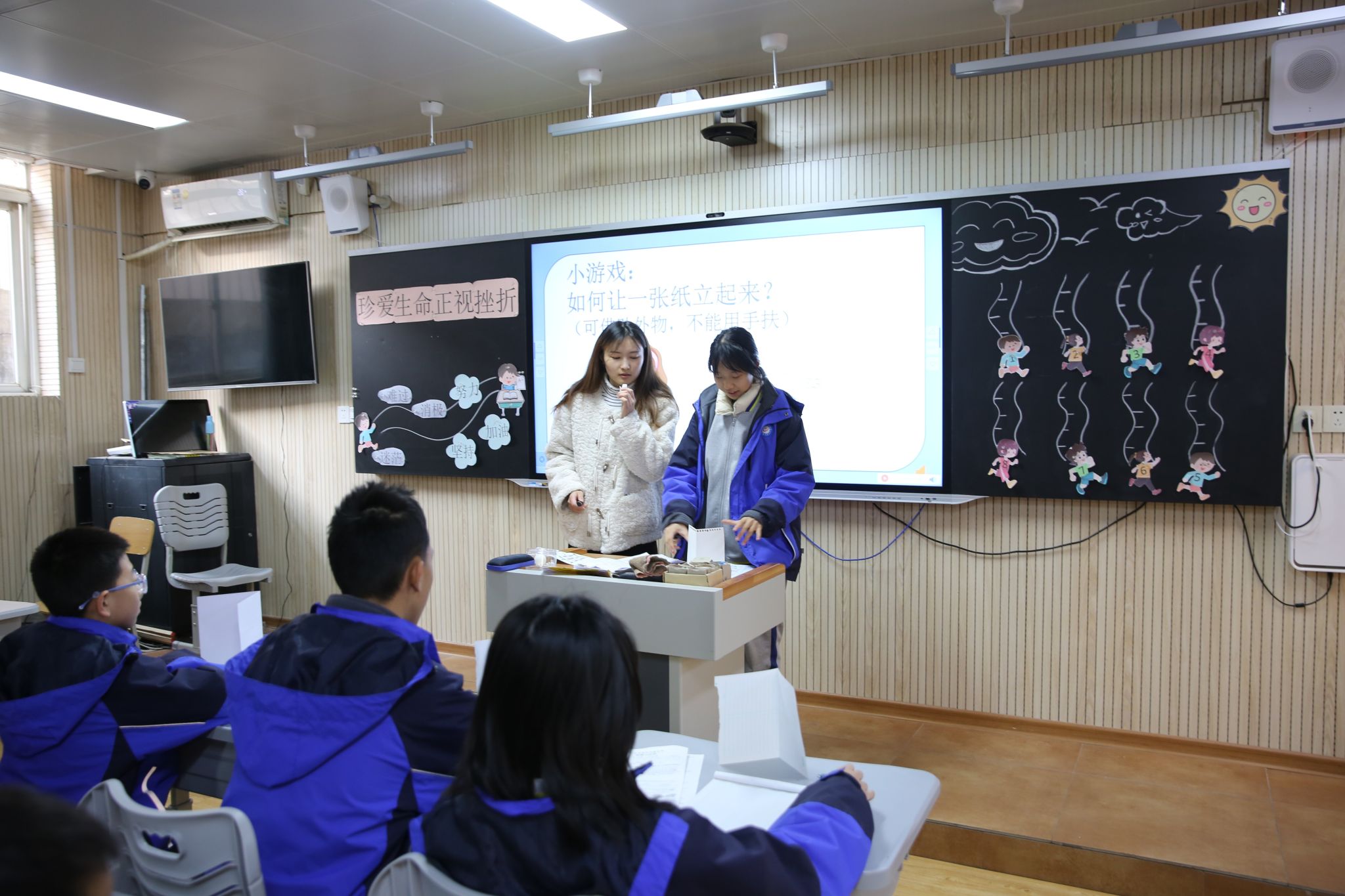 七年级2班班主任付欣洁老师以趣味实验、观影感悟、情景演绎串起课堂。白纸难立,折叠则稳,寓意磨砺方生韧性;篮球轻拍低弹、重拍高跃,诠释压力可化为动力。同时直观展示生命发育的完整过程,结合人生不同阶段的生命时长测算,让学生具象感知生命的有限与珍贵,带领同学们直面失利困境,诉说坚持蜕变的历程,深刻领悟挫折的正向价值。