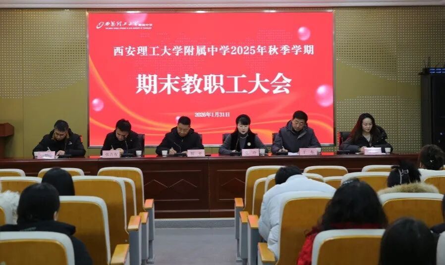 岁序更替,新程启幕。2026年1月31日,西安理工大学附属中学召开2025年秋季学期期末全体教职工大会,子弟学校党总支书记袁建,校长胡贻聪,副校长方静、曹红侠,校办主任孙伟及中学全体中层领导出席会议,会议由附属中学副校长贺平主持。